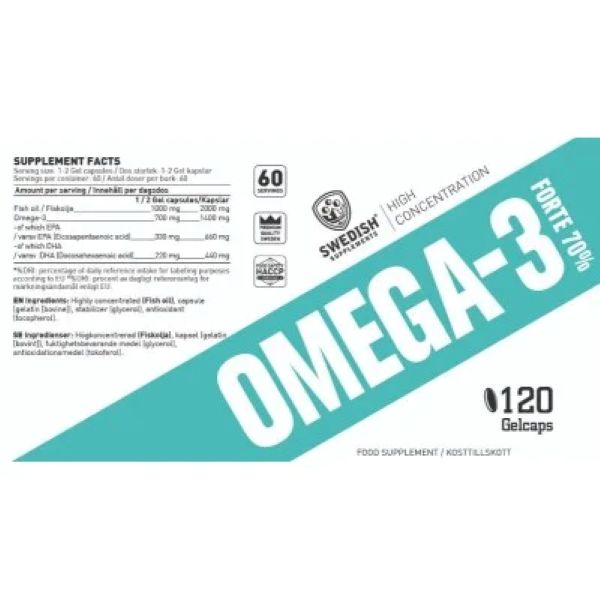 Omega 3 Forte frá Swedish Supplements er hannað fyrir þá sem láta sér ekki nægja hefðbundið lýsis- eða fiskiolíubætiefni. Hér færðu einstaklega háan styrk, eða allt að 70% Omega-3 í hverju hylki. Þægileg og einföld leið til að bæta upp fyrir fitusýrur sem margir fá of lítið af úr daglegu fæði.